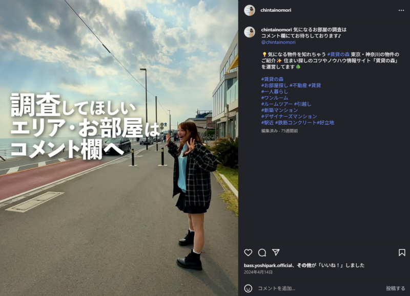賃貸の森公式Instagramでは、コメント欄で気軽に質問やリクエストを投稿することができます。もちろん、DMを利用してご相談いただくことも可能。人気物件はすぐに入居者が決まるケースも多いので、スピード感を持ってやりとりできるのは大きなポイントと言えます。