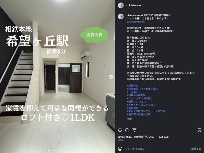 たとえばInstagramの場合、 「おしゃれな部屋」「理想のインテリア」「〇〇に住むメリット」など、視覚的な情報が豊富です。物件そのものよりも、その部屋で生活するイメージが湧きやすく、内装や日当たり、収納の様子などがリアルな視点で確認できます。